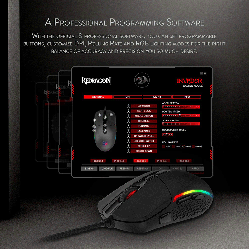 Our premium gaming mouse is the ultimate solution for most type of games. With the official & professional software, you can set programmable buttons, customize DPI, Polling Rate and RGB lighting modes for the right balance of accuracy and precision you so much desire.
