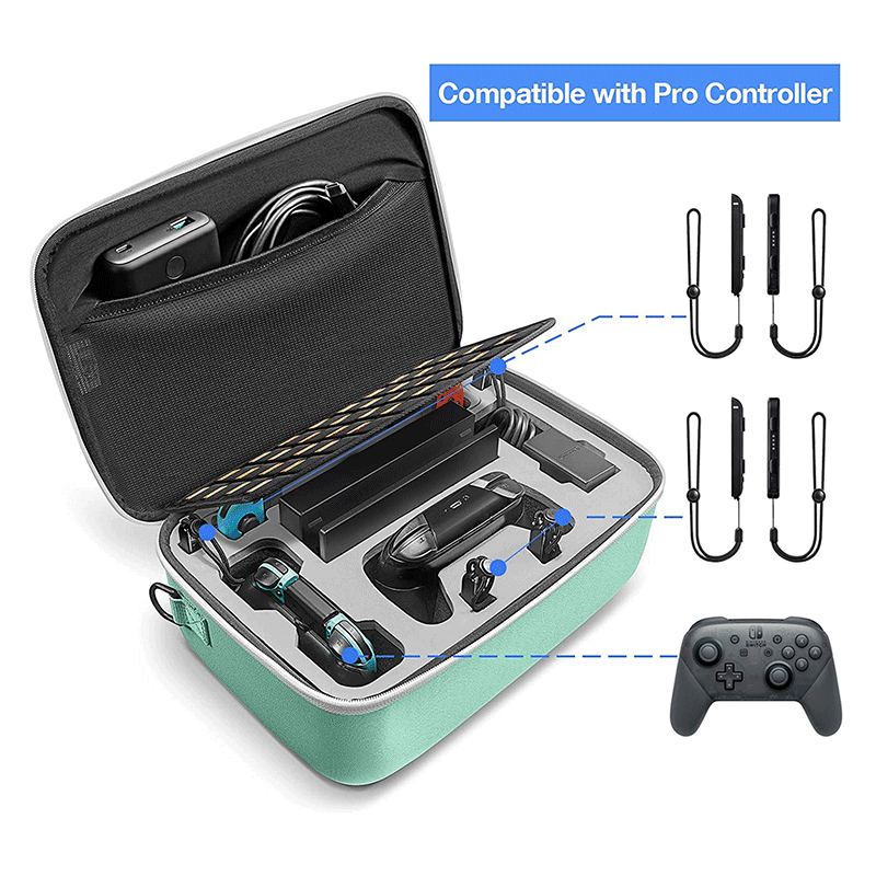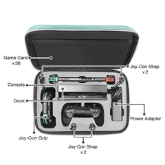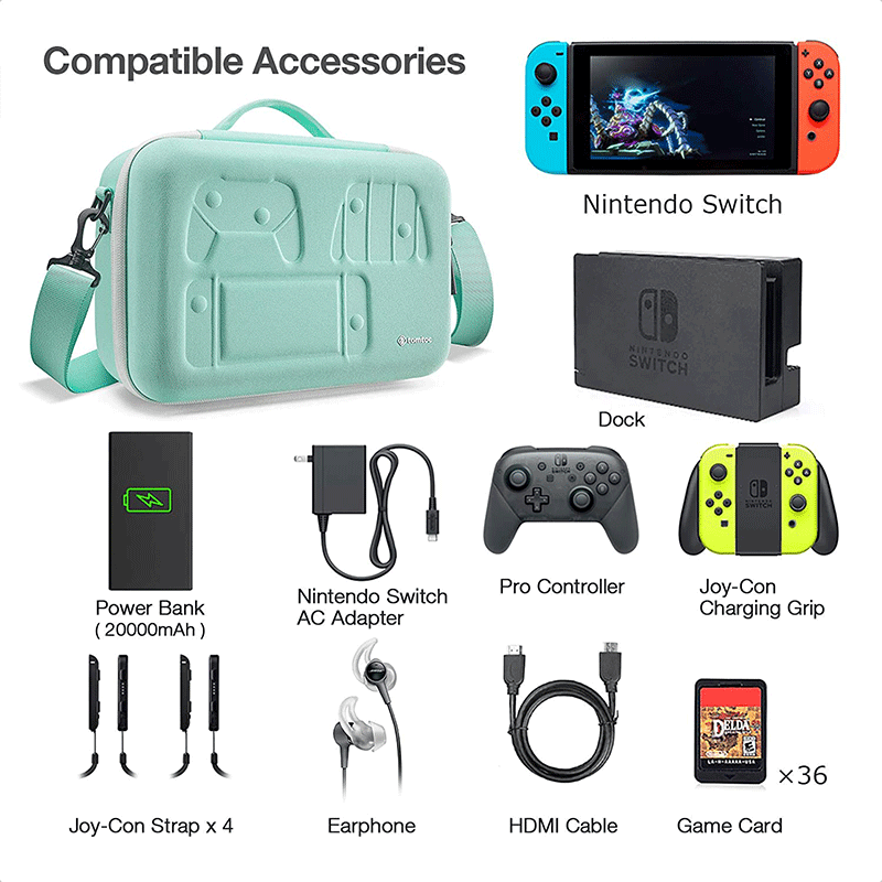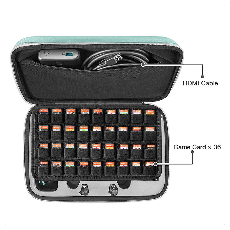 Accommodate Nintendo Switch console, dock, adapter, Pro Controller, Joy-Con grip, 4 x Joy-Con straps, 32 x Game Cards, HDMI cable and other small accessories.