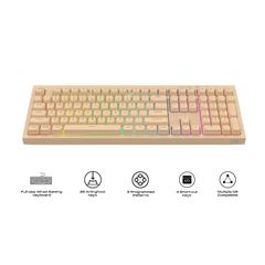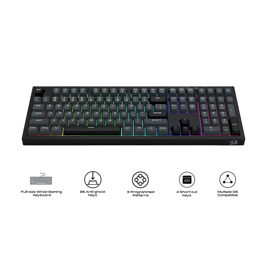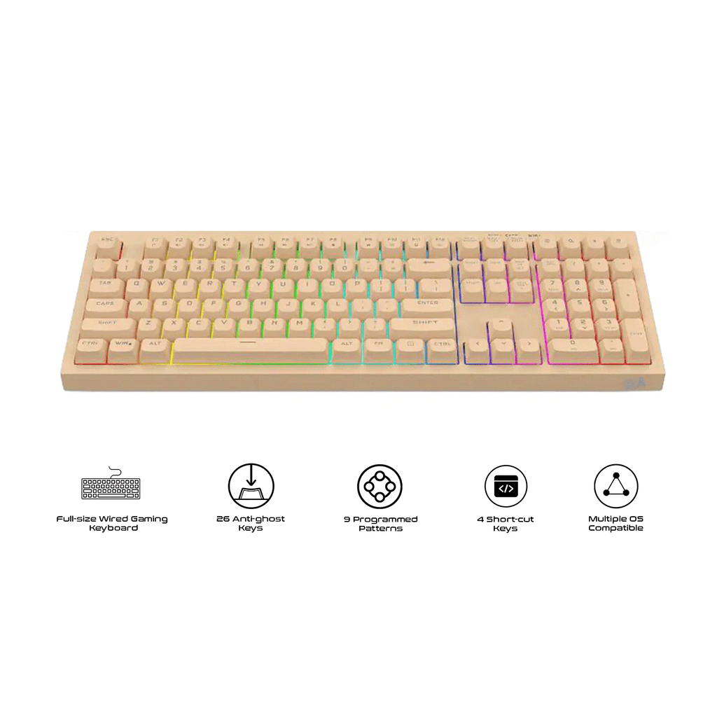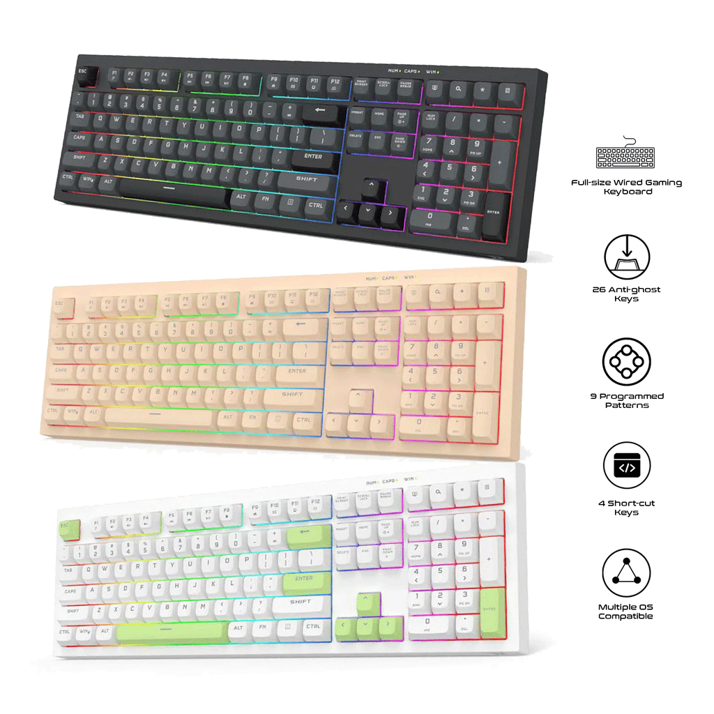 Comfort full-size wired gaming keyboard deep-cushioned keys, Numpadcompatible with multiple OSIntegrated soft-touch keyboard with satisfying typing experience.26 anti-ghost keys,125Hz report rate.4 short-cut keys.9 programmed backlight patterns.Wide compatibility for Win XP/Vista/Win 7/8/10/11.