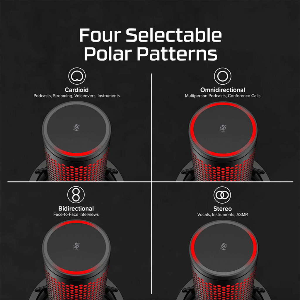 The HyperX QuadCast 2 refines everything that made the original such a favorite amongst gamers, streamers, and content creators around the world. All the fan-favorite features are still here: the iconic stunning lighting, the tap-to-mute sensor, 4 selectable polar patterns, the 3.5mm headphone jack, and included shock mount and desktop stand but now with a range of innovative additions packaged in a new sleek, full aluminum silhouette.