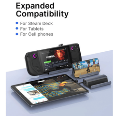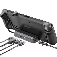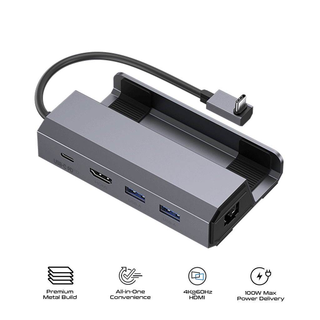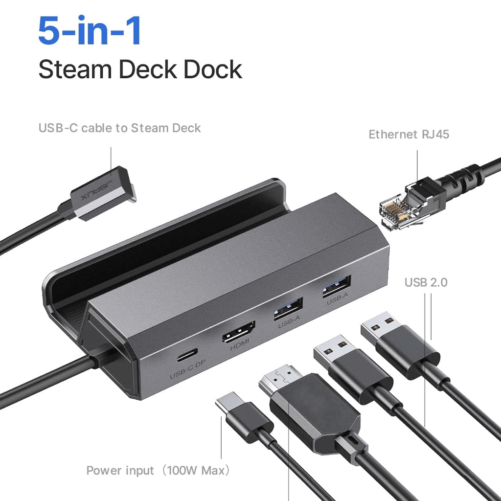 5-in-1 Docking Station: Equipped with an HDMI 4K@60Hz output, an RJ45/Ethernet input, a USB-C port for charging and dual USB-A 2.0 ports, letting you explore a new way to play with Steam Deck LCD, Steam Deck OLED, Steam Deck OLED Limited Edition White, ROG Ally, Legion Go, and MSI Claw