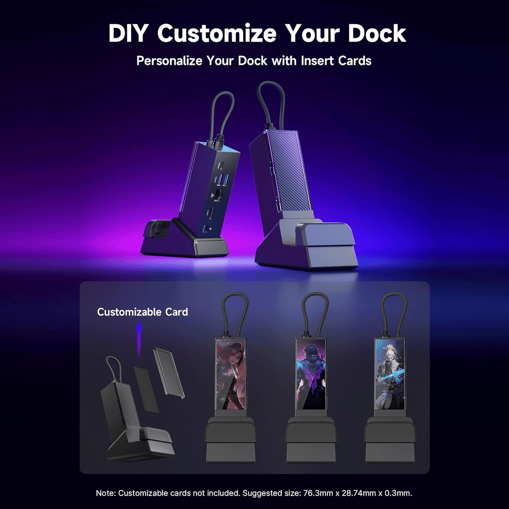 DIY Customize Your Docking Station: Easily personalize your docking station by adding a custom card between the front cover and the dock. Just remove the cover, insert your card, and snap the cover back on. NOTE: Recommended card size is 3.00" x 1.13" x 0.01" (76.3mm x 28.7mm x 0.3mm). Custom cards NOT included