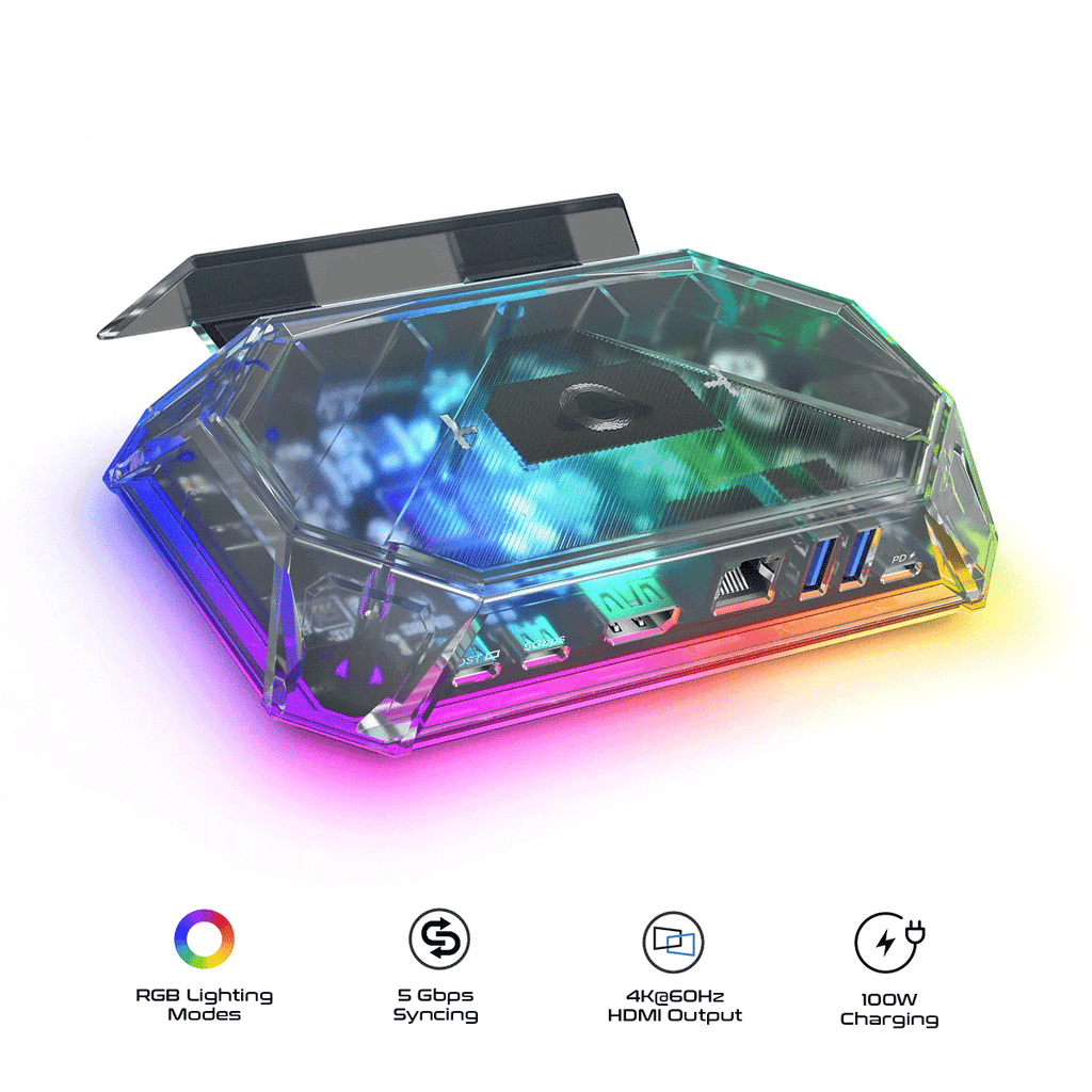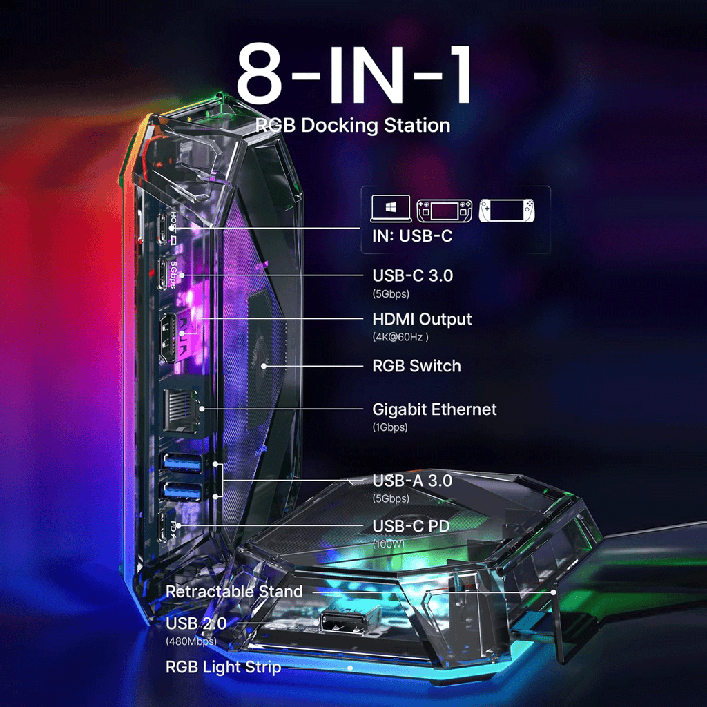 8-IN-1 RGB Docking Station: Unlock exceptional functionality with versatile ports. Includes 4K@60Hz HDMI, 2 USB-A 3.0 and 1 USB-C 3.0, Gigabit Ethernet, USB-A 2.0 , and 100W USB-C PD fast charging. Perfect for seamless work and play