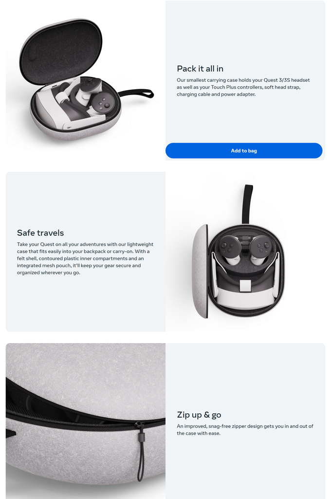 It’s designed to fit your Quest 3/3S, two Touch Plus Controllers with lanyards or Active Straps, a charging cable and adapter. With its lightweight construction, zipper opening, and rounded profile, this premium Meta accessory makes it easier than ever to access your Meta Quest 3/3S and accessories wherever you are.