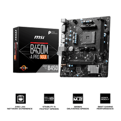 The MSI B450M-A PRO MAX II motherboard delivers robust support for a wide range of AMD Ryzen™ desktop processors, including the 5000, 4000, 3000, 2000, and 1000 series, as well as Athlon™ with Radeon™ Vega Graphics. It supports high-speed DDR4 memory up to 4133 MHz (OC) and features Turbo M.2...