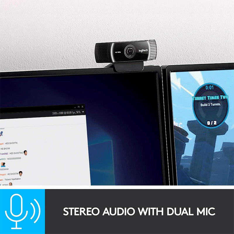 Fitted with two omni-directional microphones, the C922 Pro Webcam captures more realistic sound from multiple angles—so your voice comes through sounding natural and clear in your stream.