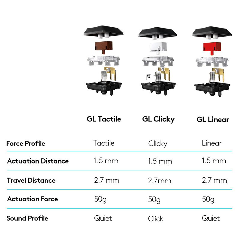 Get the speed, accuracy and performance at half the height of traditional switches. Low-profile GL mechanical switches are rigorously tested to meet strict endurance, responsiveness, and accuracy requirements.