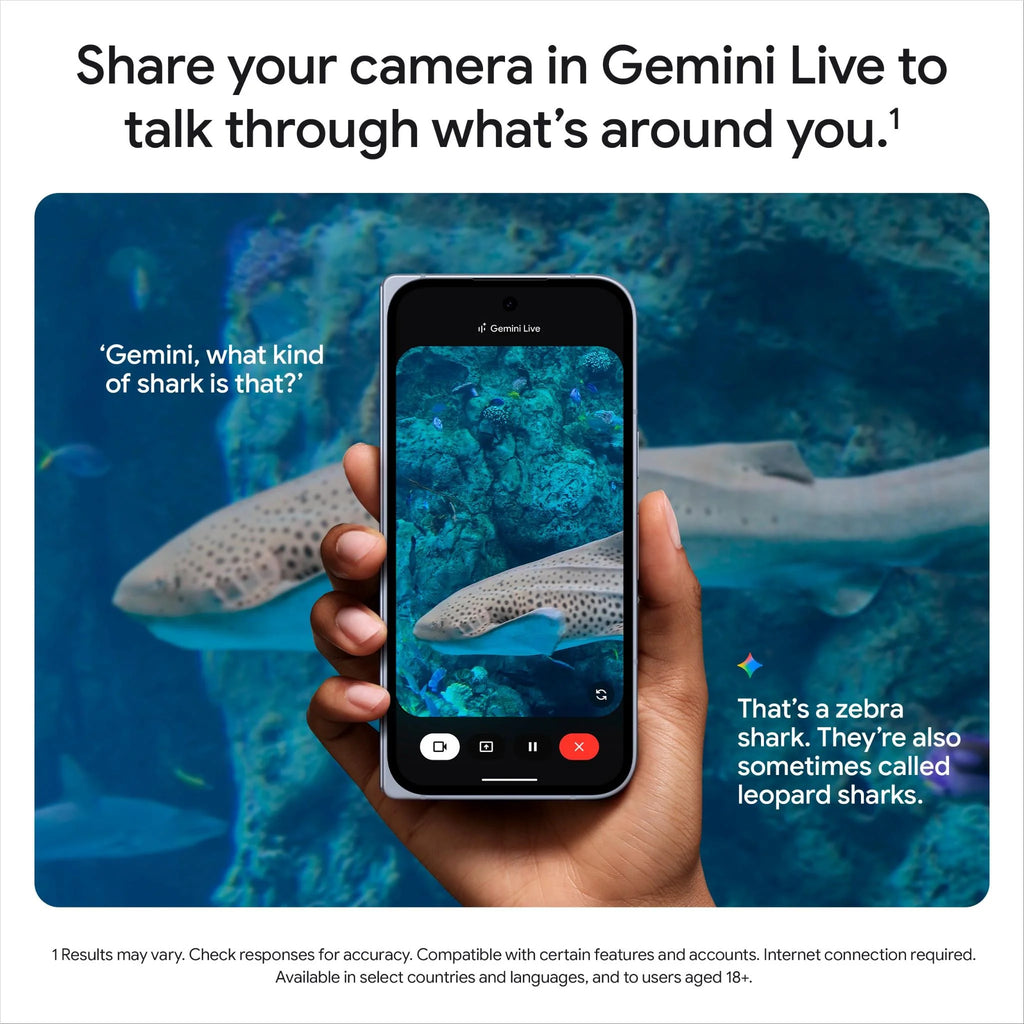 Share your camera in Gemini Live conversations to have a live back-and-forth chat with Gemini about what you’re seeing.¹¹ Show your living room to get help rearranging it. Show your pantry to get dinner ideas using those ingredients. Or show your wardrobe to get styling tips.