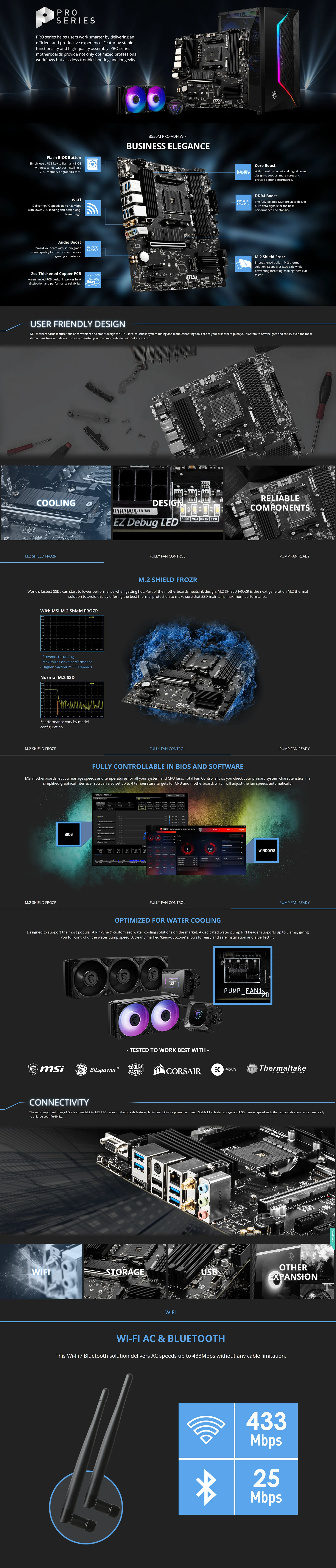 The MSI B550M PRO VDH WiFi motherboard supports AMD Ryzen™ 5000, 4000 G-Series, and 3000 Series desktop processors (excluding Ryzen™ 5 3400G and Ryzen™ 3 3200G). It accommodates DDR4 memory up to 4400(OC) MHz for enhanced performance.