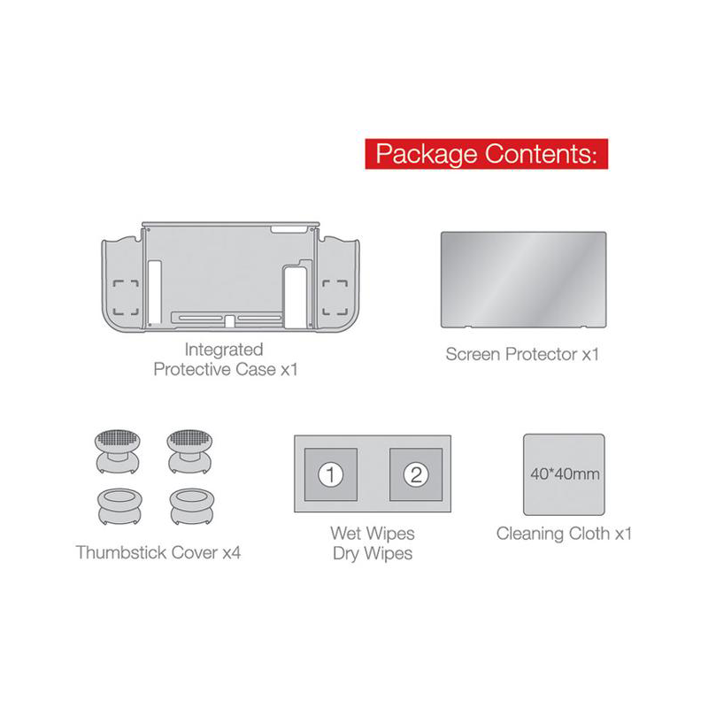 Made for Nintendo SwitchProtect your device from every bumps, scratches and dustMaterial use PC + TPUIncludes Integrated Protective Case, Screen Protector, Thumb Cover x 4, Wet Wipes / Dry Wipes, Cleaning Cloth.