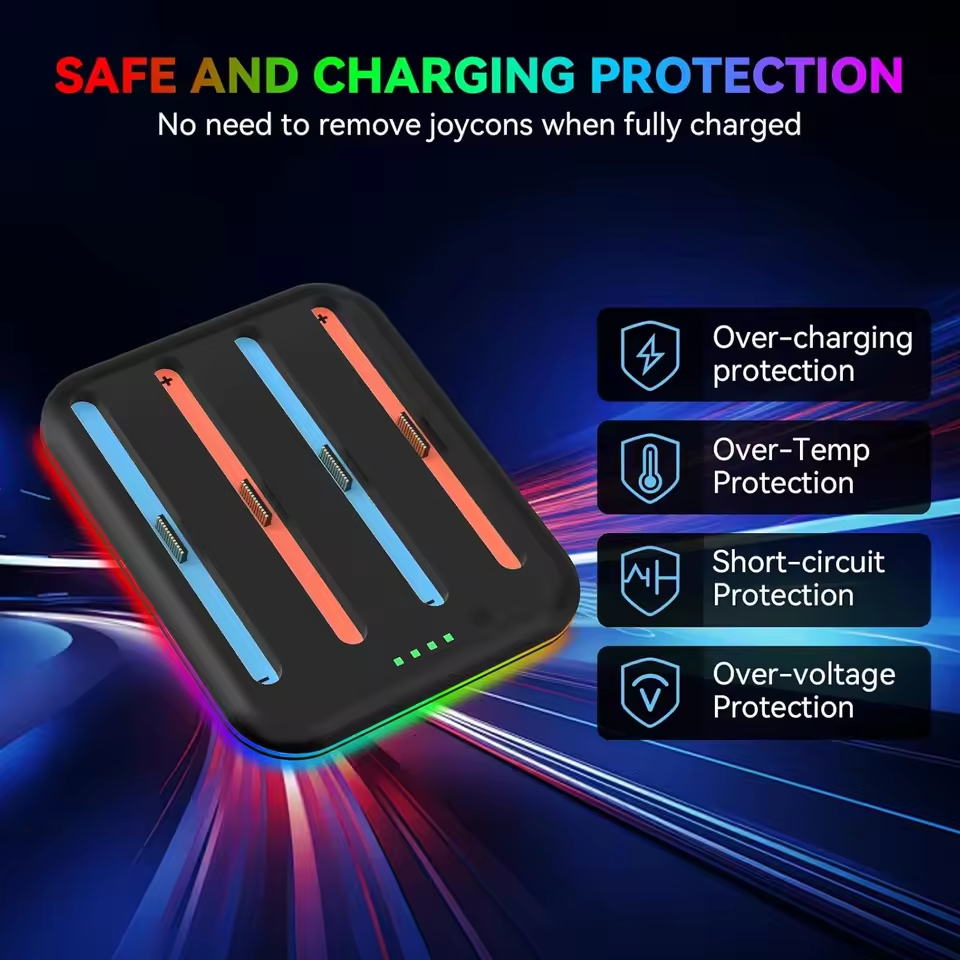 Four controllers are charged at the same time, efficient and convenient; they can charge four Joy Con controllers at the same time, and you no longer have to worry about the lack of power on the controller that affects the gaming experience
