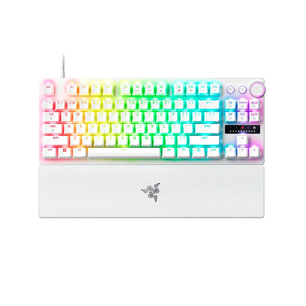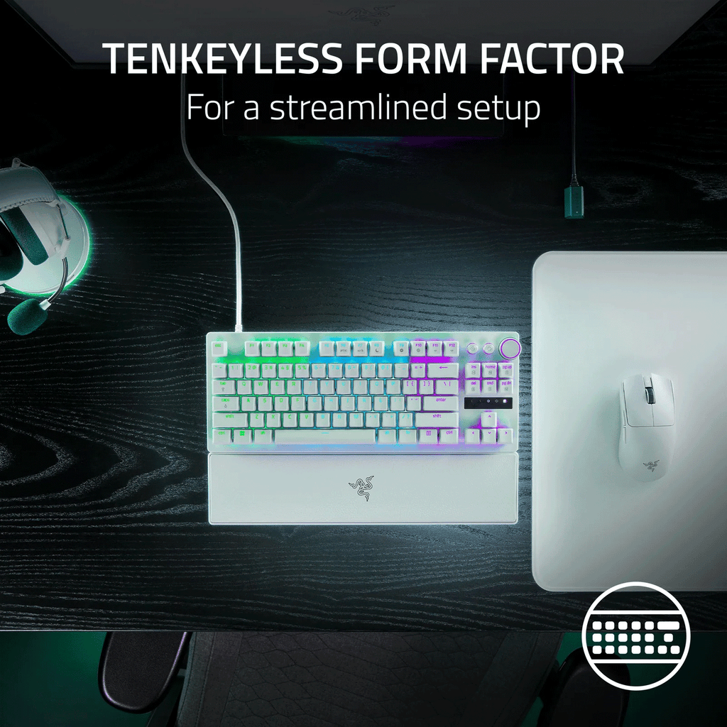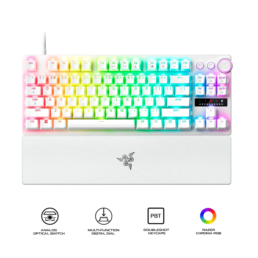 SWITCH TYPE Razer™ Analog Optical Switch APPROXIMATE SIZE TenkeylessLIGHTING Razer Chroma™ RGBWRIST REST Yes, Magnetic Firm Leatherette Wrist RestONBOARD MEMORY Hybrid on-board storage for up to 6 profilesMEDIA KEYS Multi-function Dial with 3 dedicated buttonPASSTHROUGH NoneCONNECTIVITY Detachable Type C CableKEYCAPS Doubleshot...