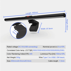 The assymetric light source design is used to Illuminate the range of the desktop directionally, without illuminating the screen and without glare while protecting the eyes.Item Specifications:Rated Voltage: DC 4V (USB connecting)Correlated Color Temp.: 3000/3500/4000/4500/5000/6000 (250K)Color Rendering Index (CRI): ≥95Nominal Power (W): 5W±10%Luminous Flux (lm): 150m±10%Wire: Type C to USB...