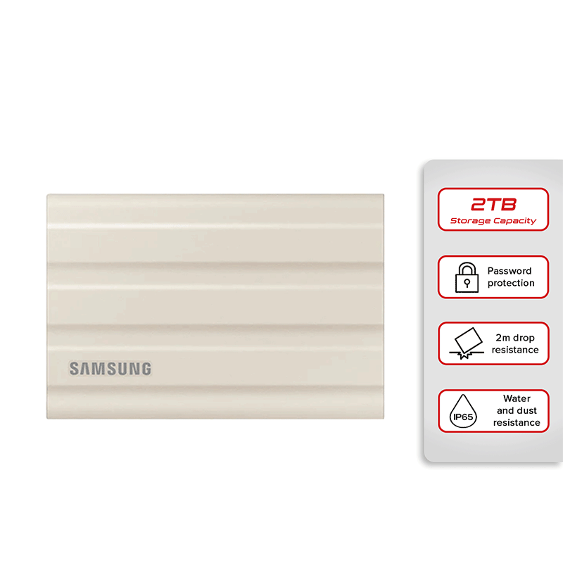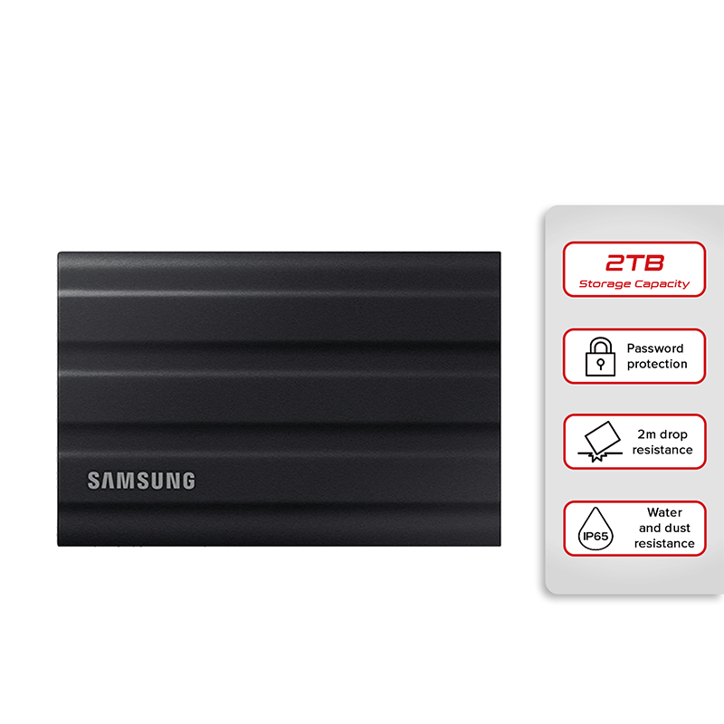 Supremely tough, fast, and compact. The new T7 Shield gives you superior performance on the go, even in challenging environmental conditions. Super-speed inside with durable protection outside keeps work flowing, ready to hand off to a client or for hands-on editing at home.