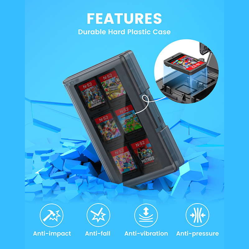 Durable Hard Shell Protection – Made from hard ABS plastic, the case is scratch-resistant, shockproof, and water-resistant, keeping your game collection safe from damage.