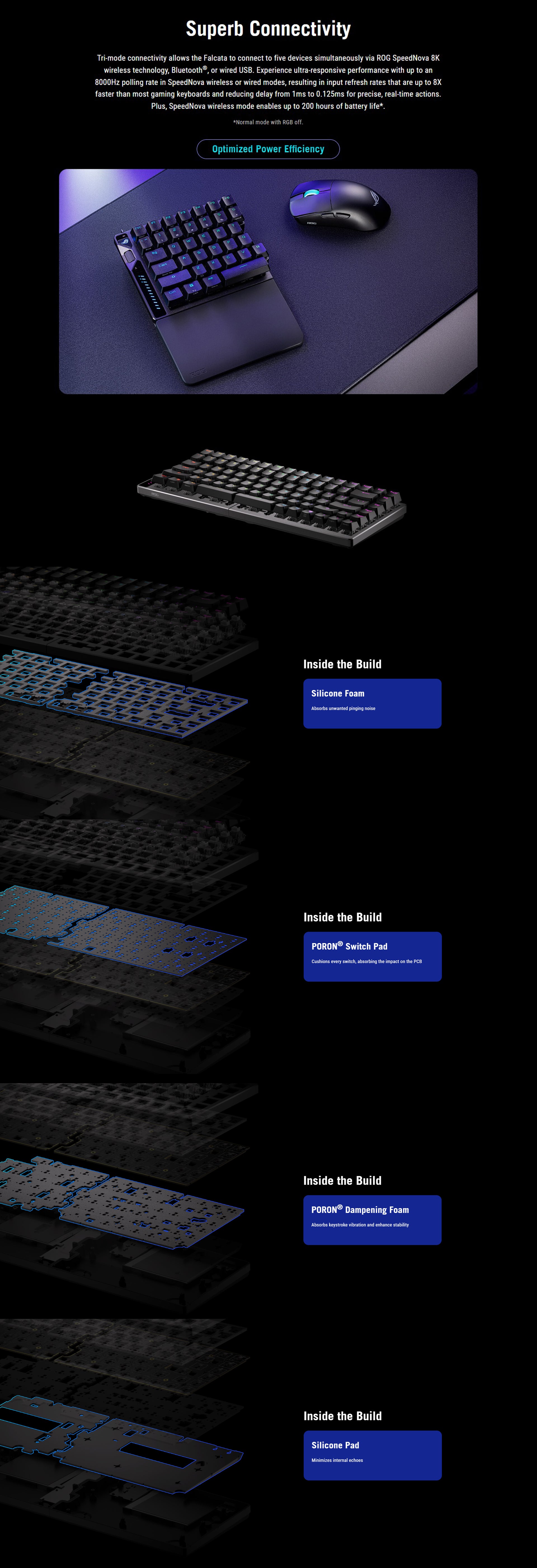 ROG SpeedNova 8K wireless technology, wired USB, and Bluetooth connectivity supports up to five devices simultaneously; wired and wireless modes offer up to 8K polling rate