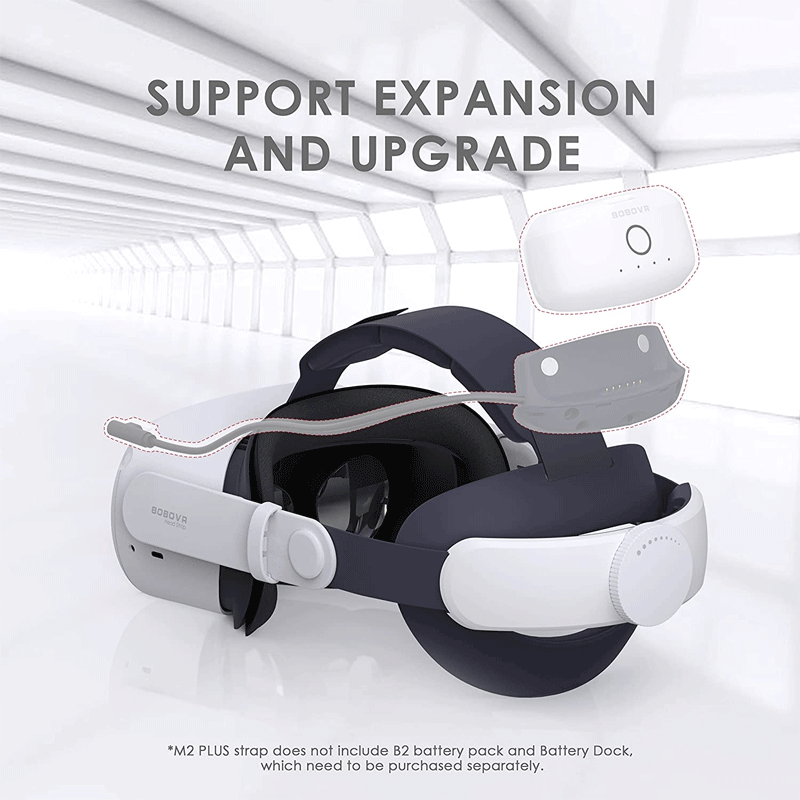 Support expansion and Upgrade, M1 PLUS strap with battery expansion port, it is convenient for users to use BOBOVR’s new Battery Dock accessory to upgrade to a battery strap version, and realize unlimited power through the alternate use of 2 B2 battery packs, so as to avoid unnecessary Necessary waste. (M1 PLUS strap does not include B2 battery pack and Battery Dock, which need to be purchased separately.)