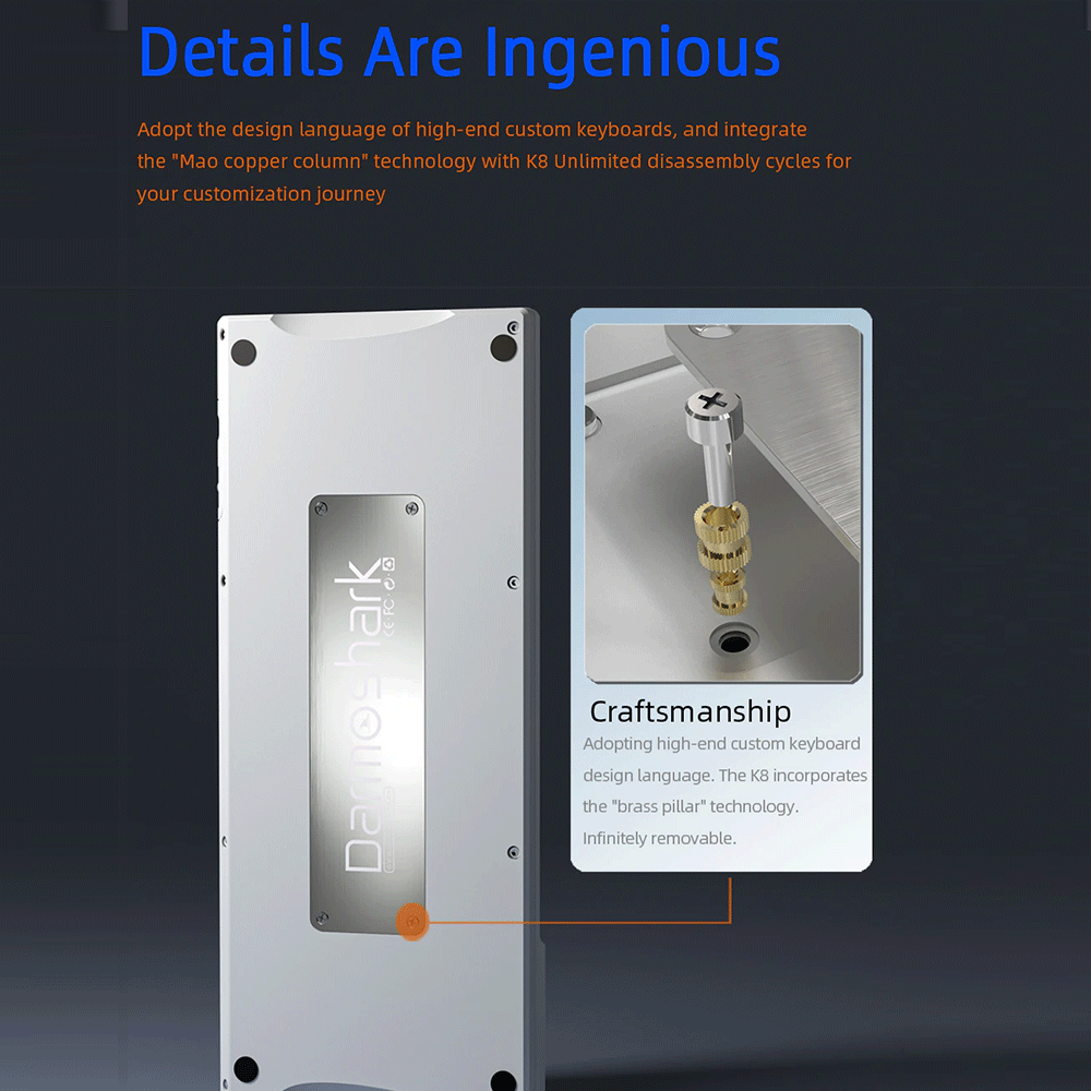 Darmoshark K8 is the brand's first-ever three-mode keyboard with a gasket structure design. It consists of a PC material positioning plate which is placed rightly between the top and bottom covers using gasket mounts. It makes typing on the keyboard comfortable and smooth with elastic typing feedback.