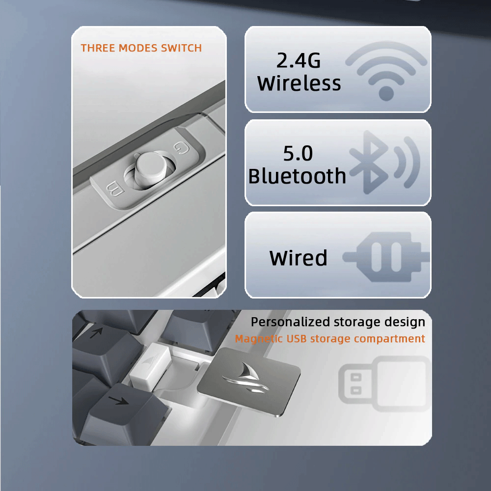 Darmoshark K8 keyboard is highly-versatile. It features three-mode connection options featuring wireless Bluetooth, Wireless 2.4GHz, and Wired USB connectivity(with a detachable Type-C cable).