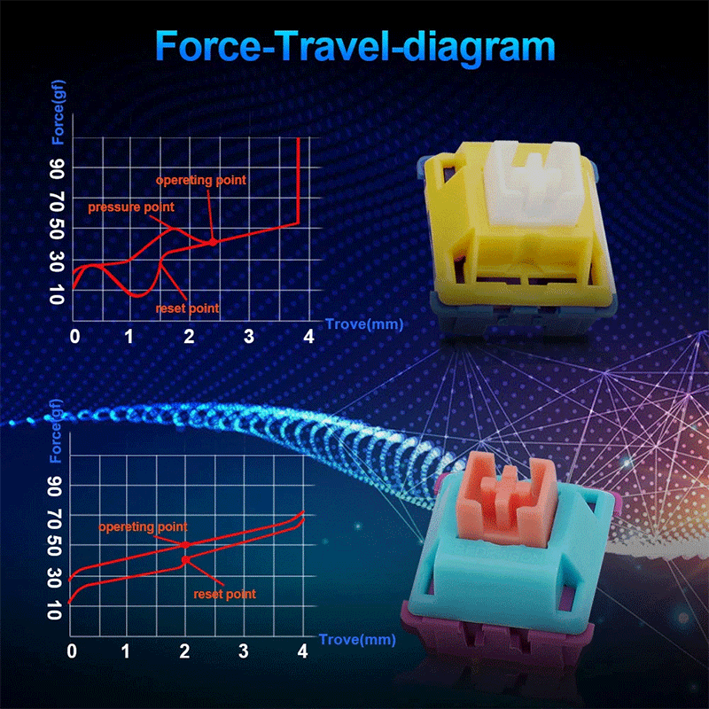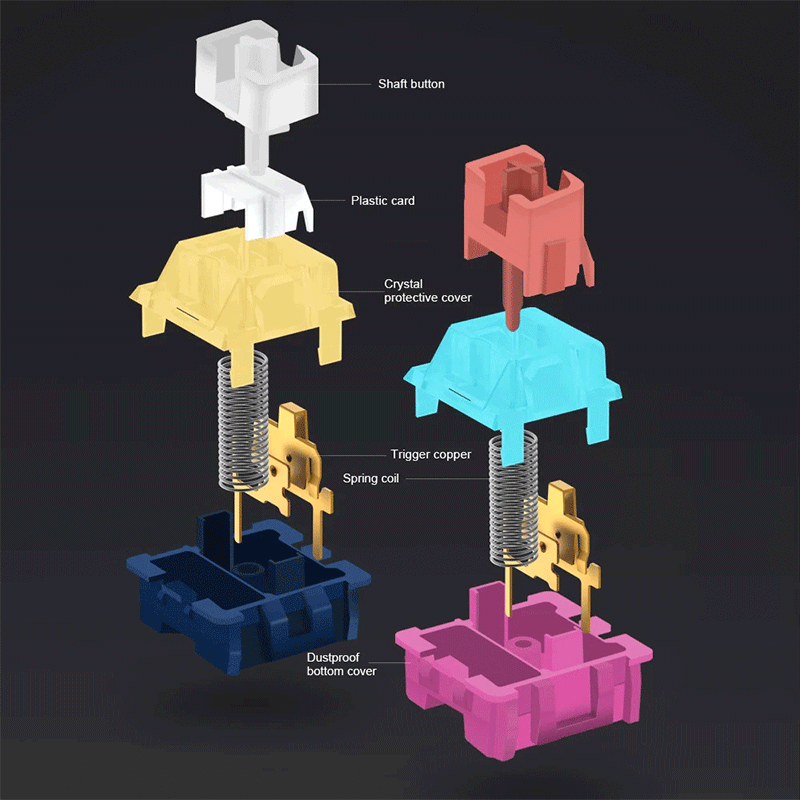 Custom switches made for DIY enthusiastsApproximate lifespan of 50 million times of keystrokeCompatible with MX style structure and fix most of keycap setsGolden switch50gf tactile switches a great option for gamingBlue switch45gf soft feeling linear switches