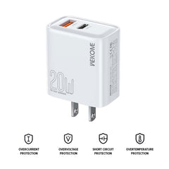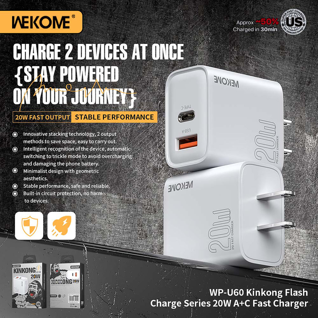 Model - WP-U60Material - PCInput Port - USInput - 110V-240V~50/60Hz 0.5A MaxOutput Ports - TYPE-C*1Output - TYPE-C*1 USB-A*1 20W(Max)Color - WhiteProduct Size - 46*29*67.5mmProduct Weight - 47gPacked Size - 120*87*35mmPacked Weight - 74g