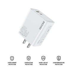 Experience rapid and efficient charging with the Wekome Flash Charge 45W A+C Fast Charger Dual-Port (WP-U64). Designed with both USB-A and USB-C ports, it delivers versatile compatibility and up to 45W total output to power multiple devices simultaneously. Its intelligent charging technology optimizes power delivery to protect your devices while minimizing charge time, making it ideal for professionals seeking reliable performance on the go. Compact and durable, this charger is perfect for maintaining peak device readiness in any environment.