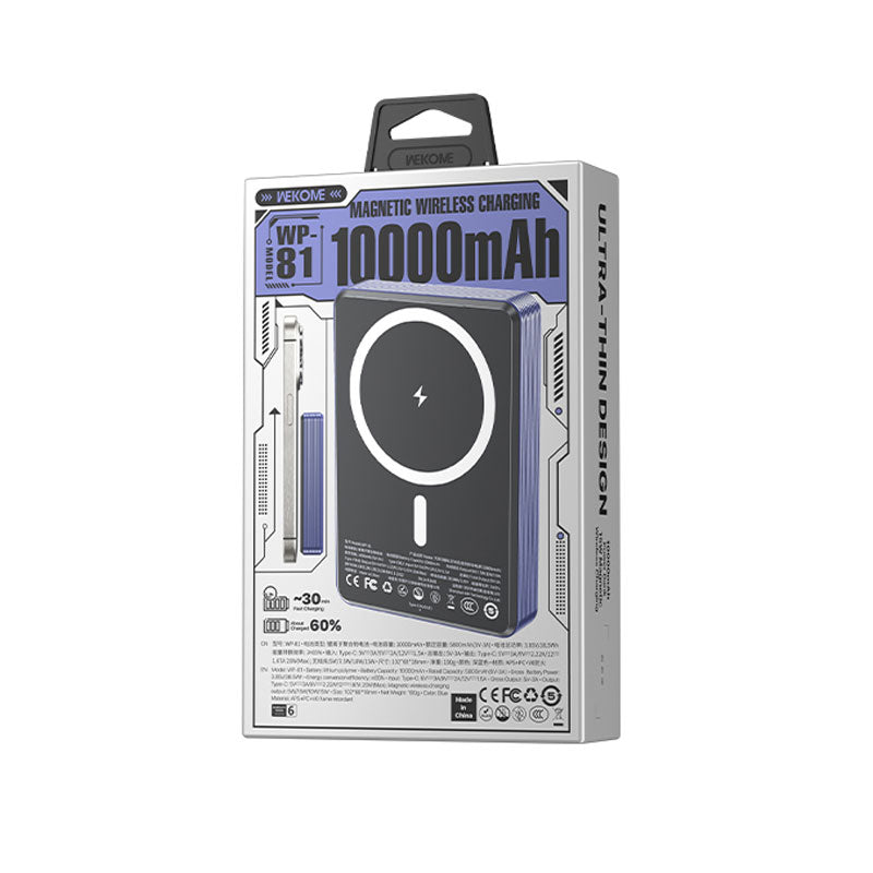 Model WP-81Material APS+PC+ V0 fireproofType of Battery Lithium polymerBattery Capacity 10000mAhBattery Life ≥300 timesRated Capacity 5800mAh(5V-3A)Input Port Type-CInput Type-C:5V-3A/9V-2A/12V-1.5AOutput Ports Type-C、wireless chargingOutput Type-C: 5V-3A/9V-2.22A/12V-1.67A 20W(Max) Wireless charging: 5W/7.5W/10W/15WPower Display Light display