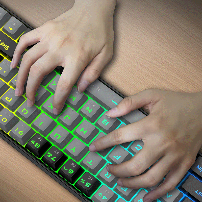 by "FN2+9", you can also adjust light brightness by "FN2 + -/+". In addition, You can also enter custom lighting setup mode by "FN2+ ←". If you need't backlit then you can turn off by "FN2+0". The double-shot injection molded keycaps provide elegant and clear uniform backlight without glare.