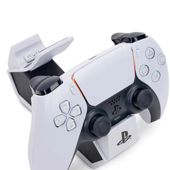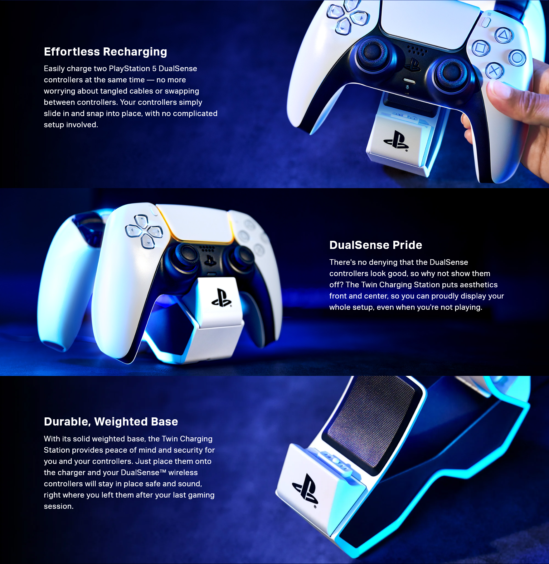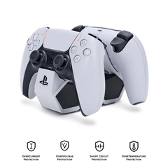Charge two PS5 DualSense controllers simultaneously with the PowerA Twin Charging Station. This sleek white dock features dual charging slots designed specifically for Sony's premium controllers, ensuring optimal power delivery without overcharging. The compact design fits seamlessly into any gaming setup while keeping your controllers organized and ready for action. Perfect for competitive gamers and households with multiple players who demand reliable, efficient charging between sessions.