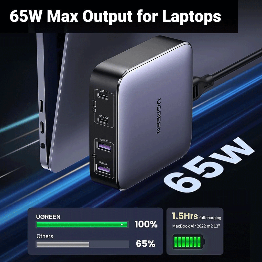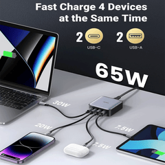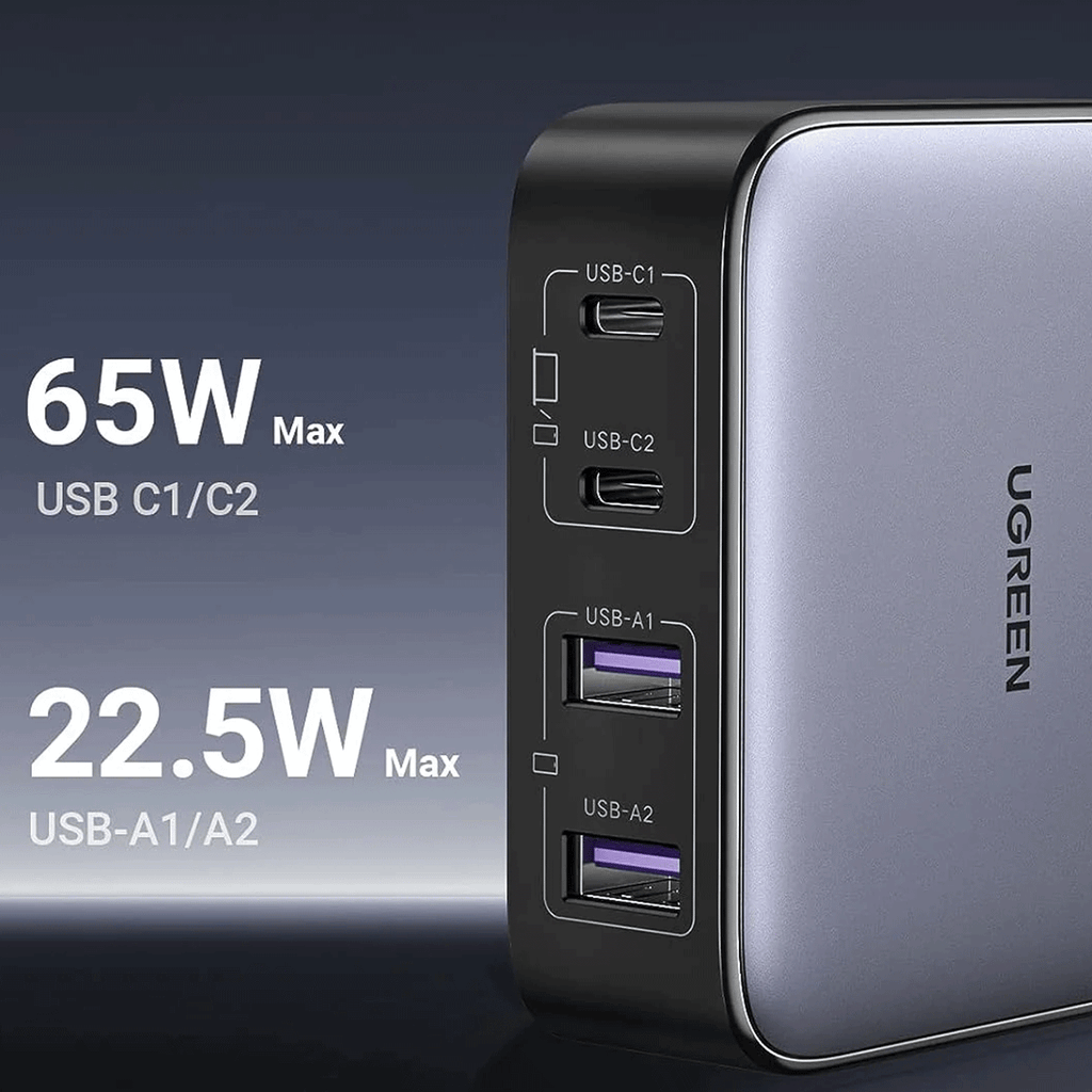 At roughly 3" square, the 65W GaN 4-Port USB Desktop Charging Station from UGREEN demands a small space on your desktop, while supplying big charging capabilities. You get two USB-C and two USB-A ports, letting you charge up to four devices at the same time. Using GaN technology, even at a compact size, you get a significant amount of power. Up to 65W can be charged amongst the four ports, with individual USB-C use offering up to 65W, and individual USB-A ports offering up to 22.5W.