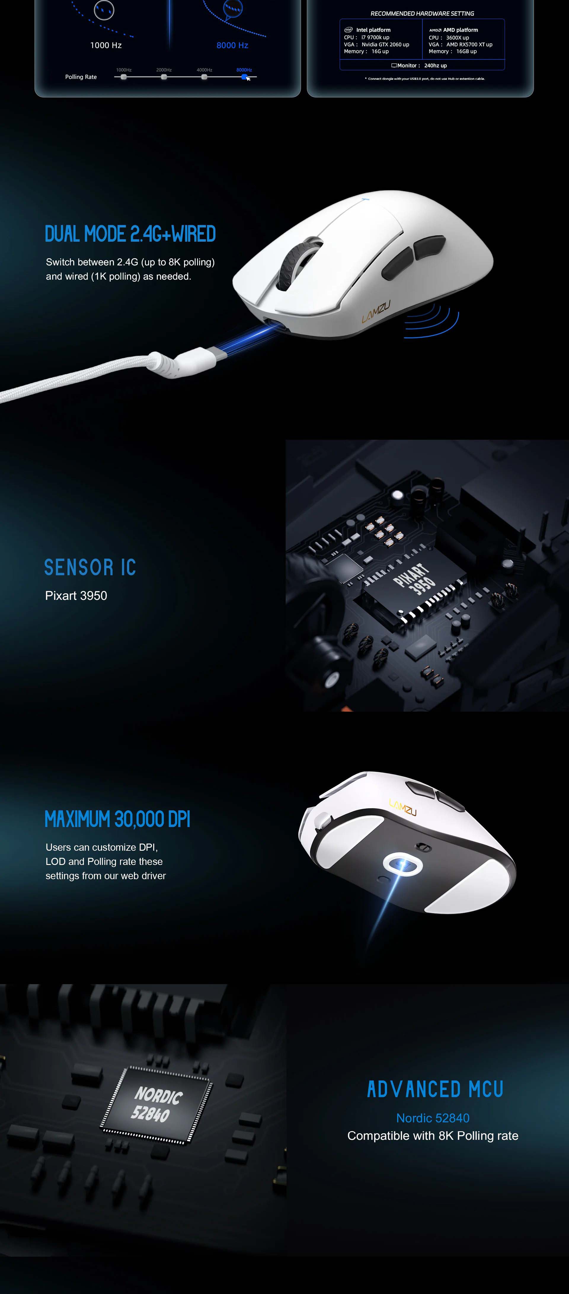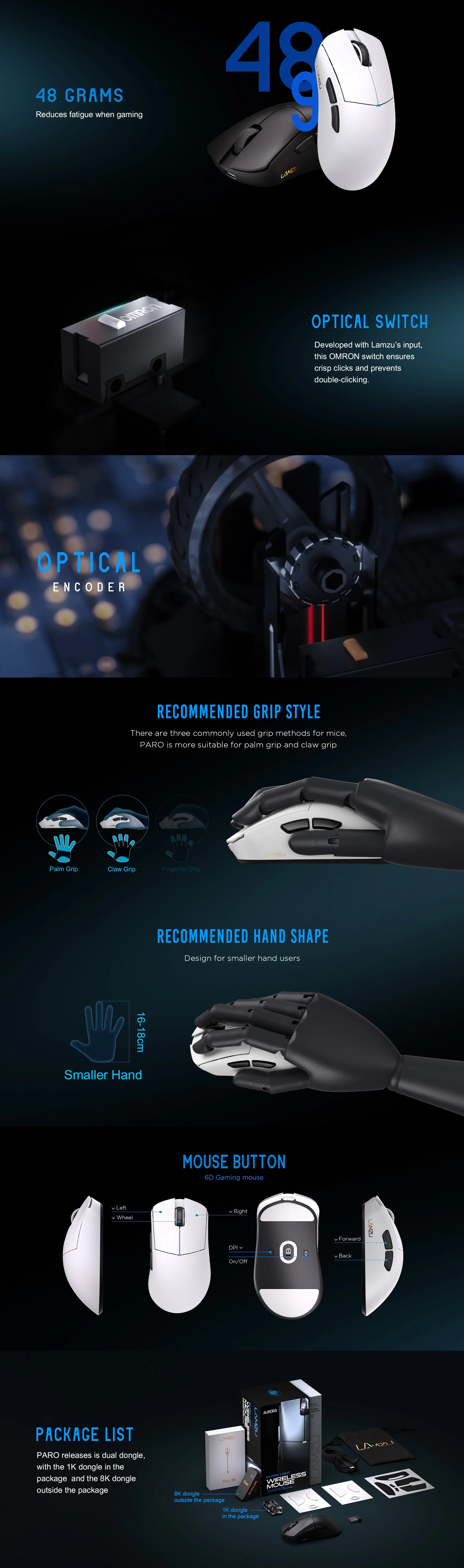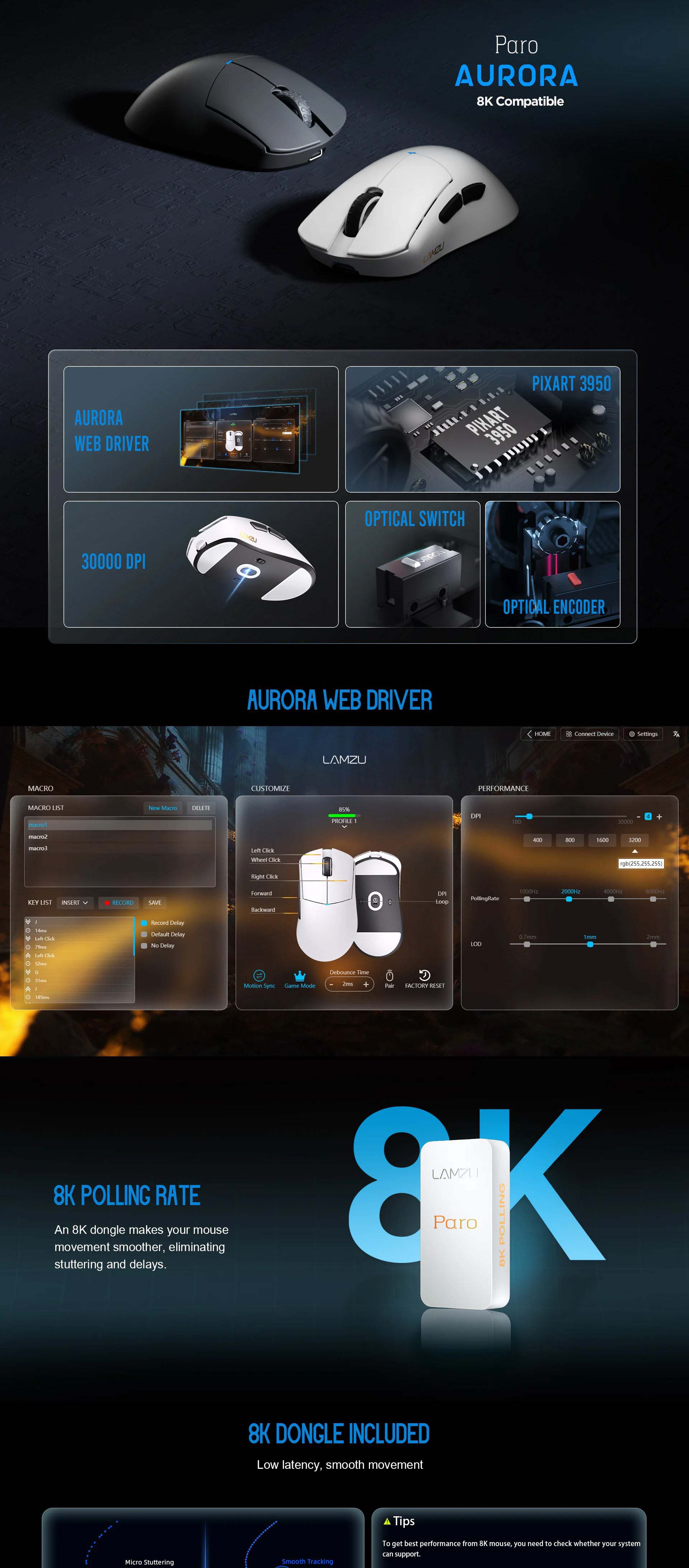 The Lamzu Paro Aurora Superlight delivers competitive-grade performance in a featherweight wireless package. Engineered for esports precision, this mouse features an 8K polling rate for ultra-responsive tracking that eliminates lag during intense gameplay.
