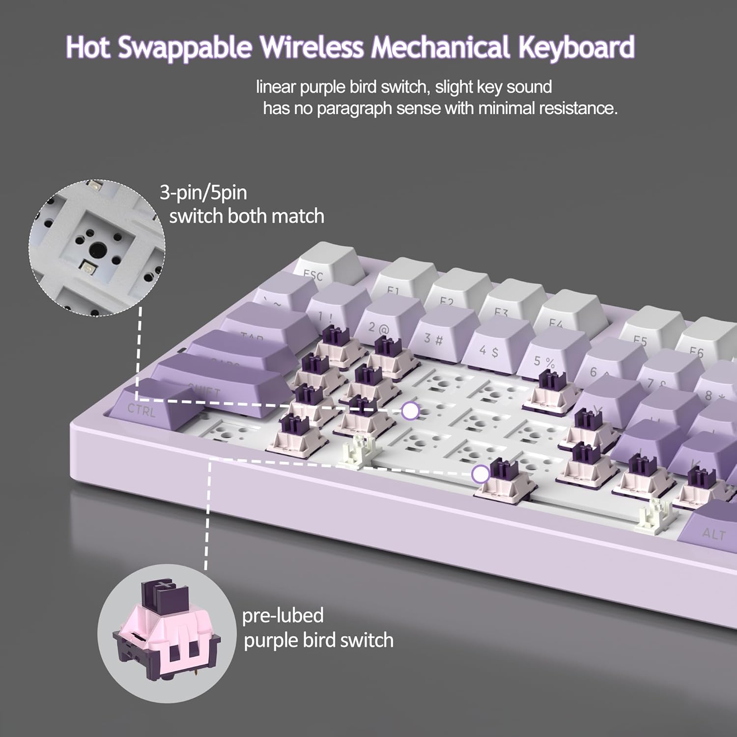 Compatible with 3-pin and 5-pin switches, the hot-swap design allows effortless customization without soldering, catering to your preferred typing feel.