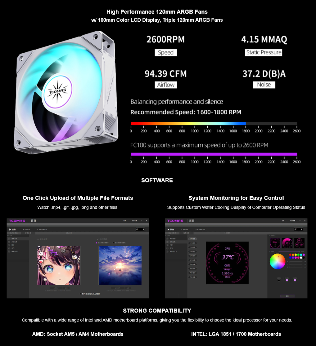 The TCOMAS WG600 delivers premium CPU cooling with a 360mm radiator and three ARGB fans engineered for optimal thermal performance. The integrated LCD screen displays real-time CPU temperature and system metrics, keeping you informed during intense gaming or workloads. Synchronized ARGB lighting creates stunning visual effects across your build. Designed for compatibility with major socket types, this all-in-one liquid cooler combines efficient heat dissipation with customizable aesthetics. Perfect for enthusiasts seeking reliable cooling and dynamic RGB integration in a single solution.