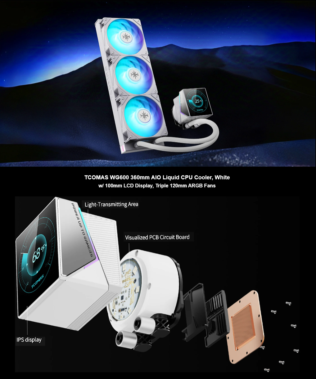 The TCOMAS WG600 delivers premium CPU cooling with a 360mm radiator and three ARGB fans engineered for optimal thermal performance. The integrated LCD screen displays real-time CPU temperature and system metrics, keeping you informed during intense gaming or workloads. Synchronized ARGB lighting creates stunning visual effects across your build. Designed...