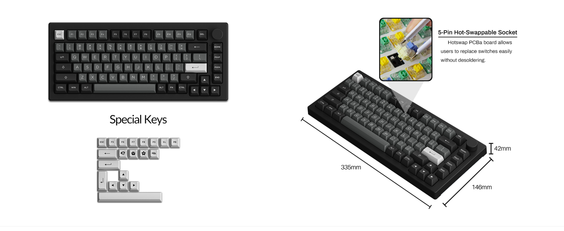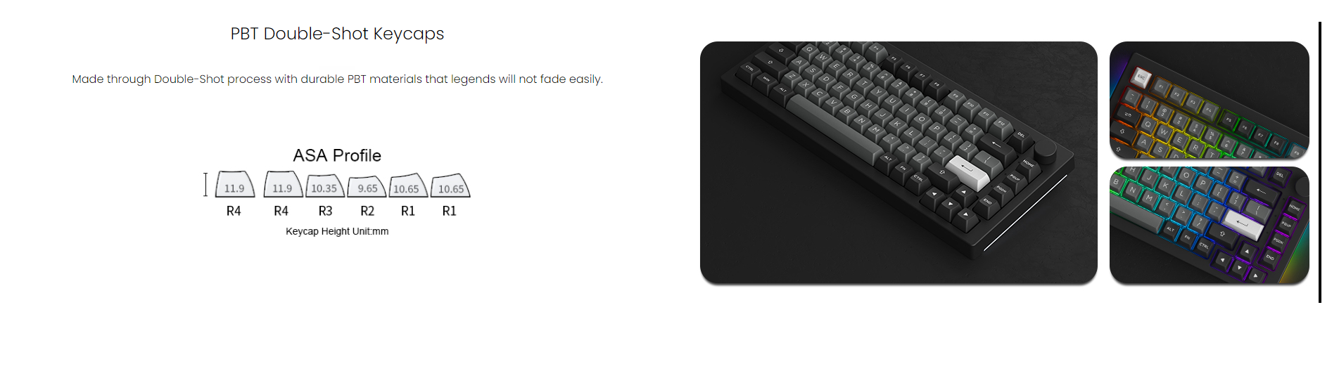 SPECIFICATIONS:Macro - Akko Macro V1.0N-Key Rollover - SupportedDisable Winlock - SupportedRGB EffectsHot-Swappable - YesModel - 5075B PlusDimensions - 335*146*42mmMaterial - PBT MaterialProfile - ASAPrinting Technology Double-ShotSide-Printed - N/A