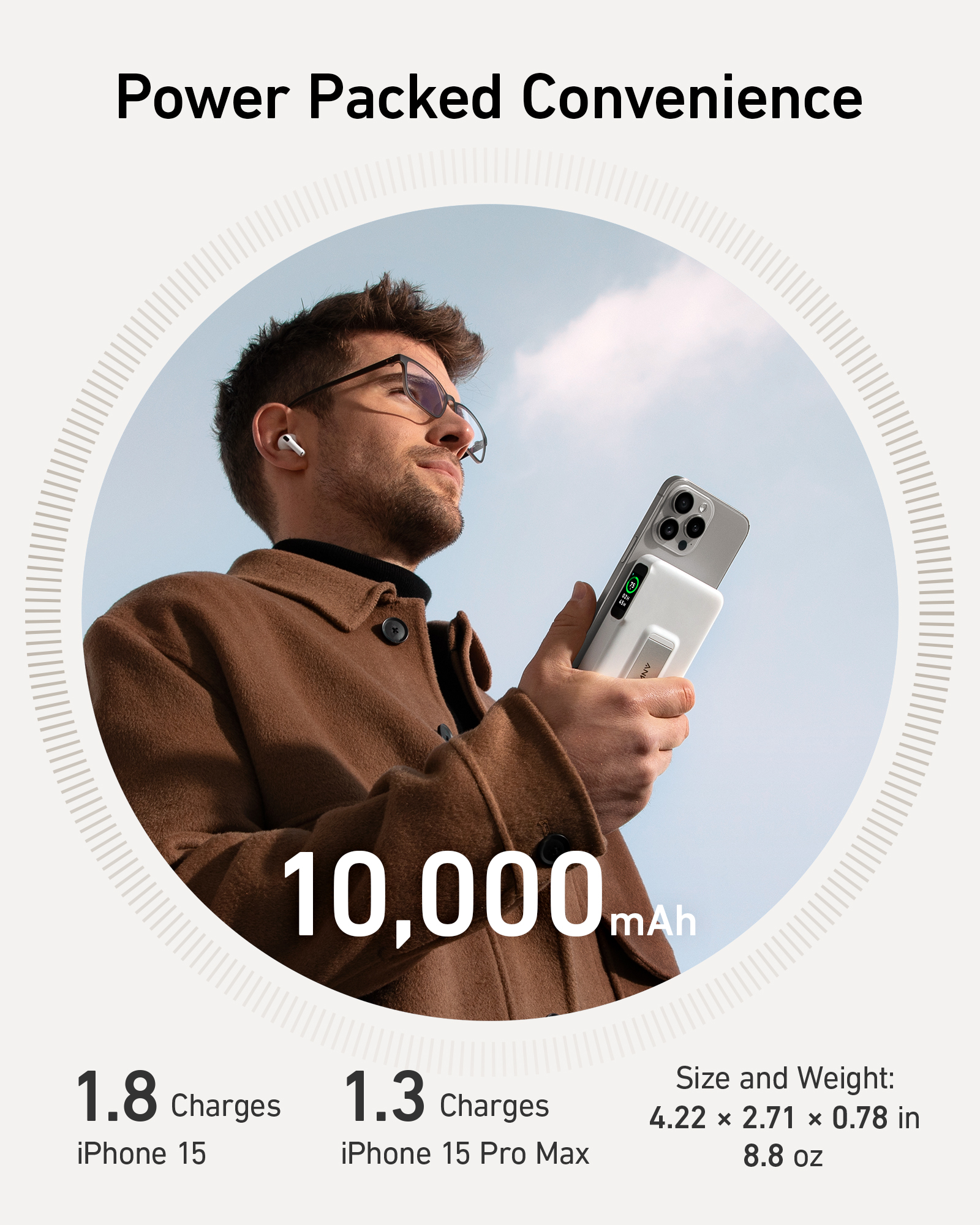 Power Up and Prop Up: With a powerful 10,000mAh, secure 1.8 charges for your iPhone 15 Pro and enjoy hands-free viewing with the built-in stand.