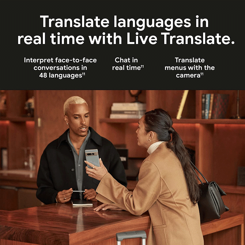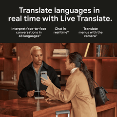 With Live Translate, you can interpret face-to-face conversations in 48 languages, chat in real time, and translate menus with your camera.₄