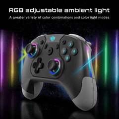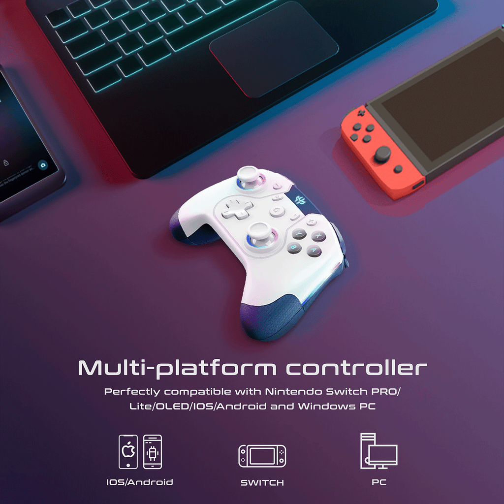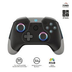 GXM Alpha 4in1 Pro Controller For Android/IOS/Switch/PC WIRELESS RGB PRO CONTROLLER SWITCH console Bluetooth connection PC computer wireless connection (Compliance with GT USB Dongle) Phone Connect : IOS | Android Support Nintendo Switch Console above 3.0.0. Support SWITCH, PC D_INPUT and PC X_INPUT. Four blue LED channel indicators, LED light mode...