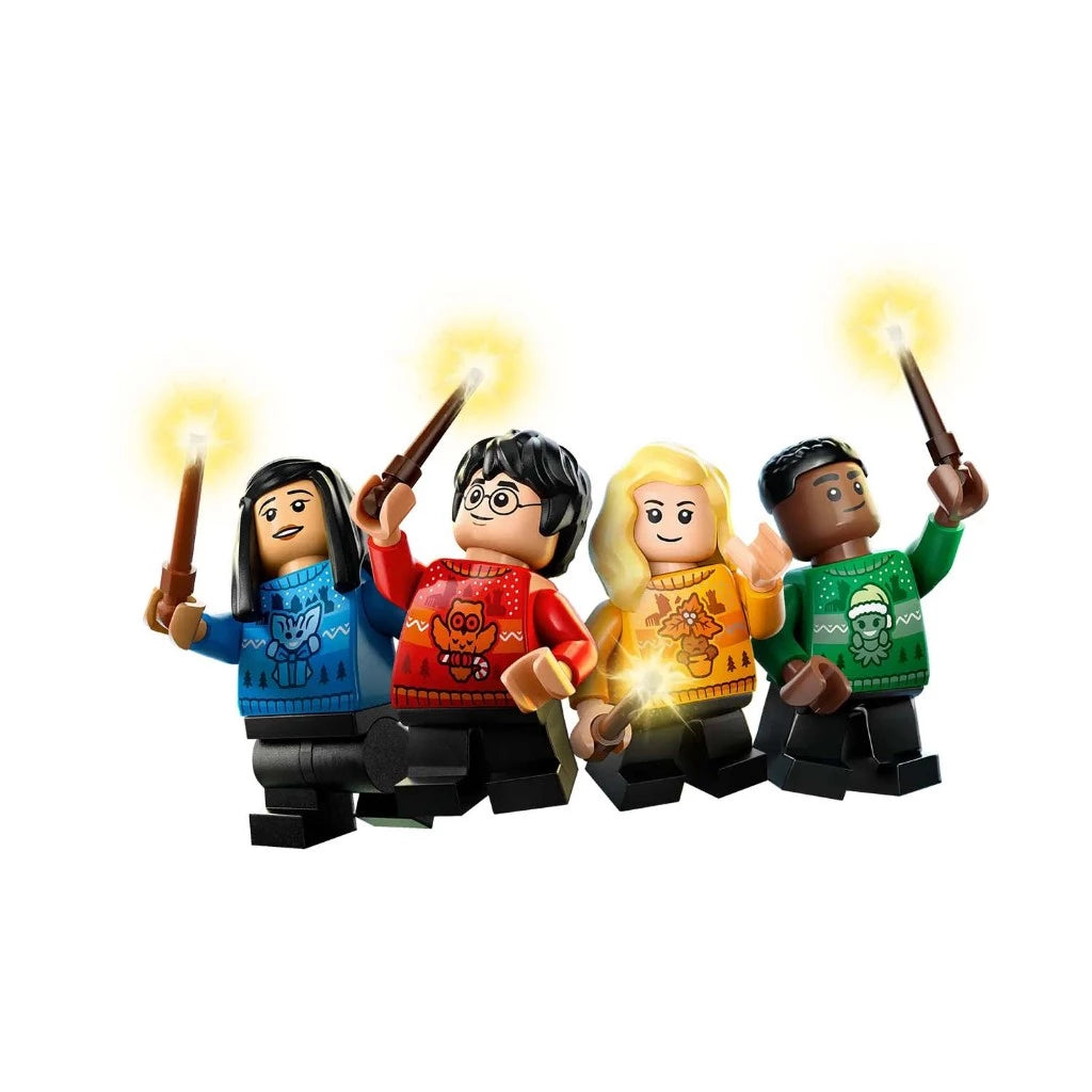8 LEGO® minifigures – Harry Potter™, Cho Chang™, Draco Malfoy™, Hannah Abbott, Angelina Johnson, Luna Lovegood™, Blaise Zabini and Cedric Diggory, all in Hogwarts™ Christmas sweaters and with wands