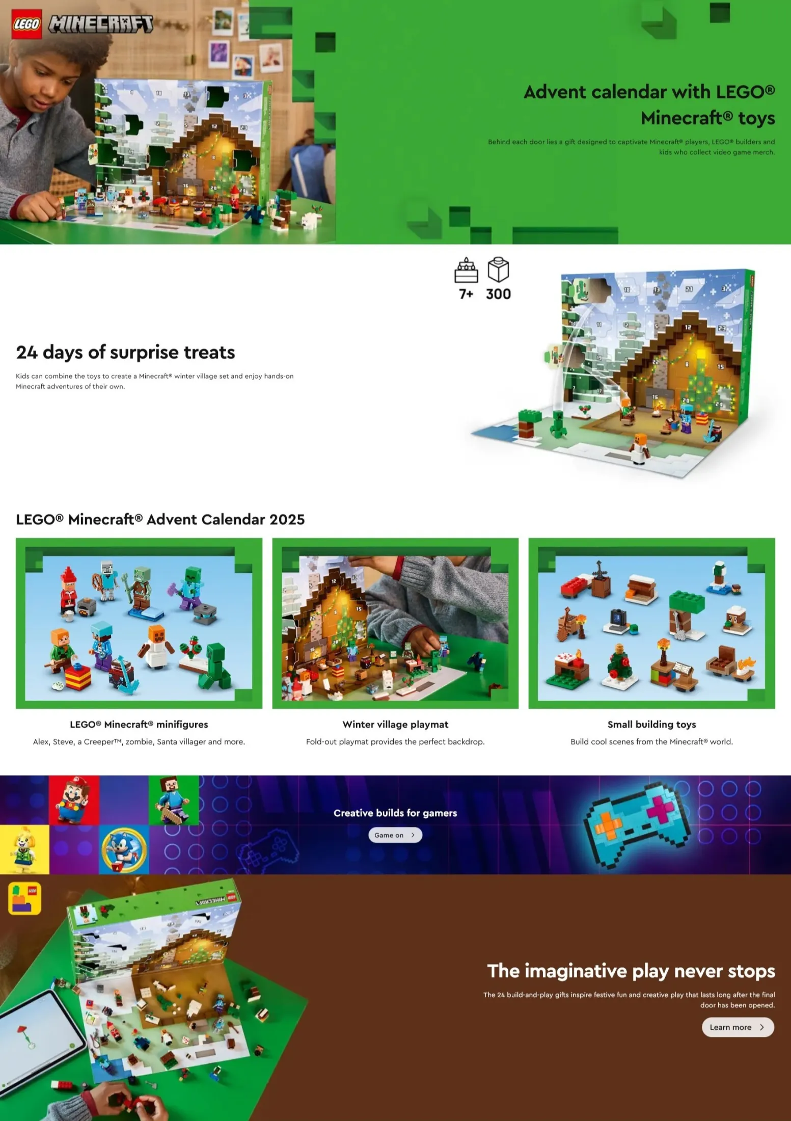 Imaginative role-play for kids – As the big day approaches, children can combine the gifts to create a Minecraft® winter village set and enjoy hands-on Minecraft adventures of their own