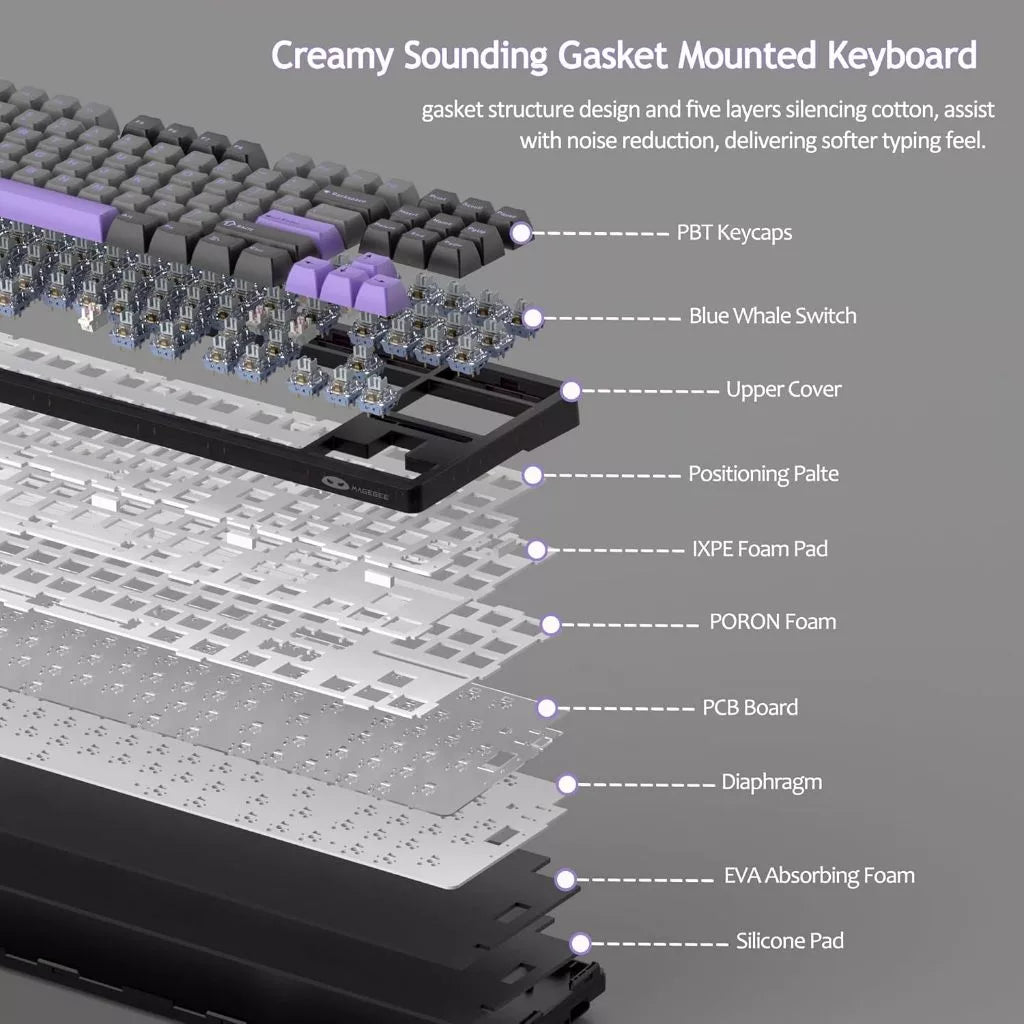 MageGee Light87 is designed with Gasket mount structure, and 5 sound absorbing layers, which brings creamy sound and soft bouncy touching feeling.