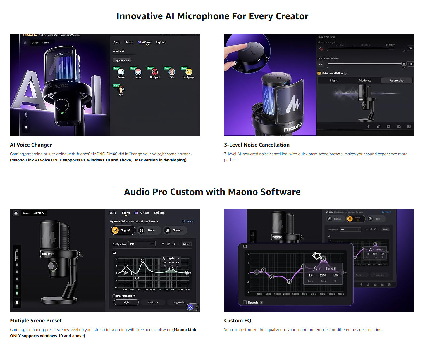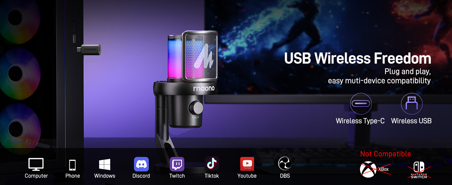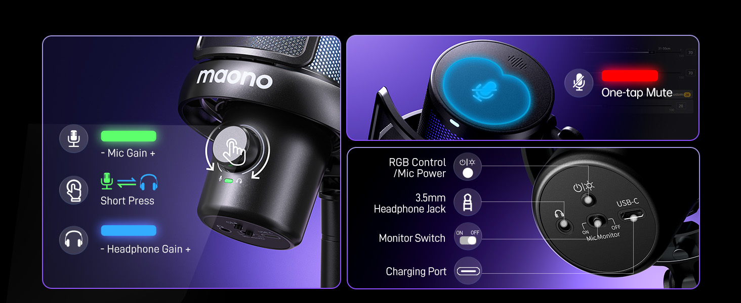 Easy Control & Monitoring: With the gaming microphone with the Maono link app, you can easily manage all your recording needs. One-tap scene presets EQ settings, AI voice changers, noise-canceling, volume, gain, mute, zero-latency monitoring, and RGB lighting to create a truly personalized recording experience. Whether you’re streaming, gaming, or recording, it’s all at your command with just a few taps, making your audio sessions fun, flexible, and completely in your control